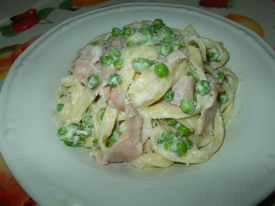 - 400 gr. di Tagliatelle, 150 gr. di Piselli Surgelati, 120 gr. di Prosciutto Cotto, 2 Cucchiai d’Olio, 100 ml di Panna, Sale, Parmigiano Grattugiato.