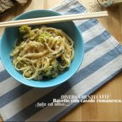 Un primo a base di bavette con tofu marinato (in salsa di soia, olio evo, vino bianco ed erba cipollina), cavolo ro