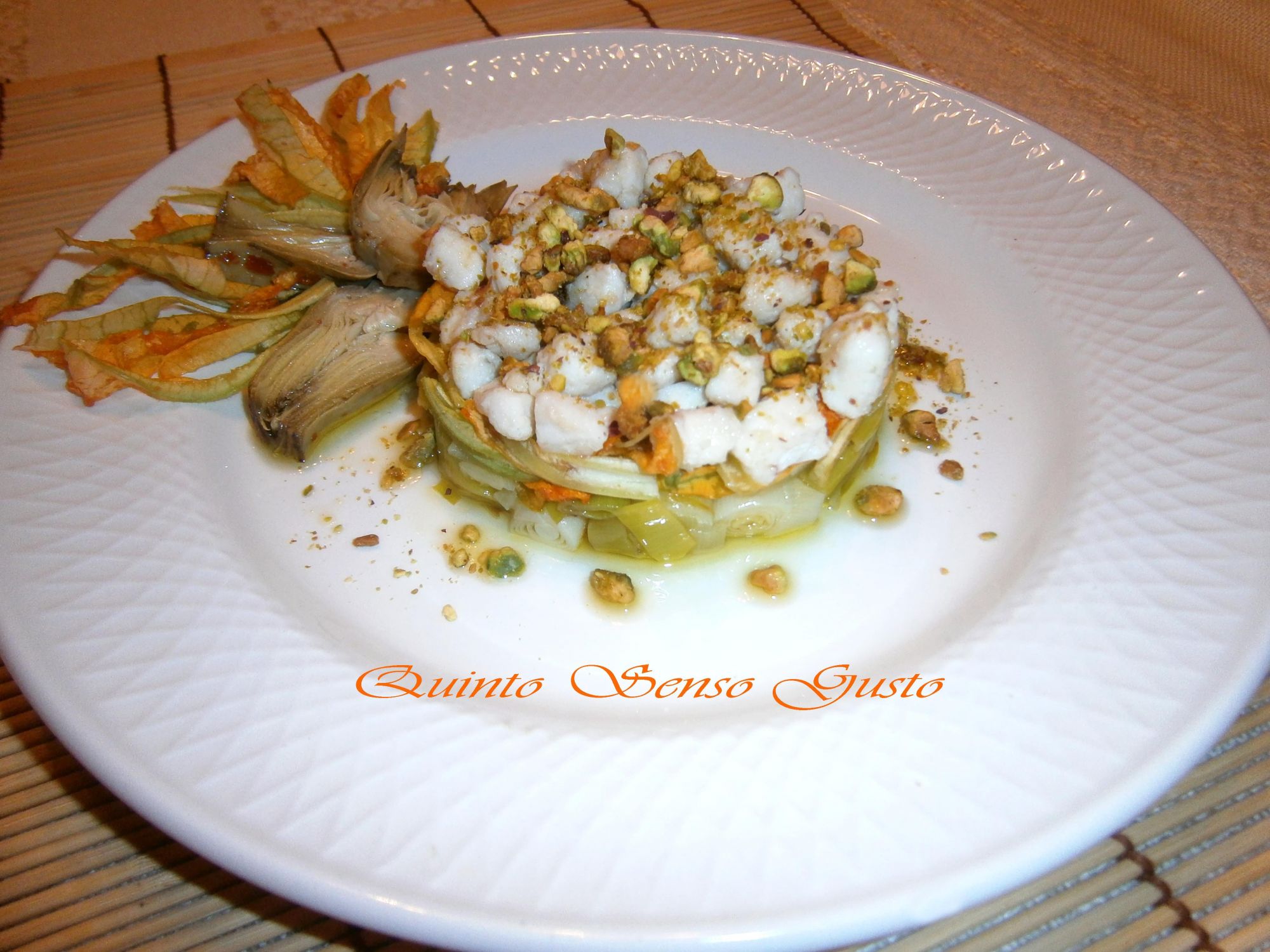 - 500 g. di pesce spatola, 12 fiori di zucca, 2 porri, 50 g. di pistacchi tritati, 4 carcioghiotti Ponti, 1 cucchiaio e mezzo di Dolceagro Ponti, olio evo Biologico Tripodi e sale q.b.