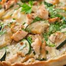 - 1 disco di pasta sfoglia, 2 uova, 300 ml di panna liquida, 50 g di grana padano grattugiato, 100 g di emmenthal, 300 g di zucchine, 2 peperoni, 2 spicchi d'aglio, 4 cucchiai di olio, burro, sale, pepe basilico