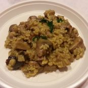 - 400 grammi di riso, 450 grammi di petto di pollo, 40 grammi di funghi secchi, 50 grammi di burro, una costa di sedano, 1 bicchiere di cognac, 1 carota, 1 cipolla, 150 grammi di pelati, 1 litro di brodo di carne, parmigiano, sale e pepe.