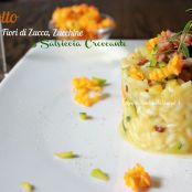 Risotto con zucchine, fiori di zucca e salsiccia croccante