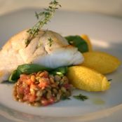 Filetto di lucioperca profumato al timo con lenticchie brasate e gallette di farina di mais