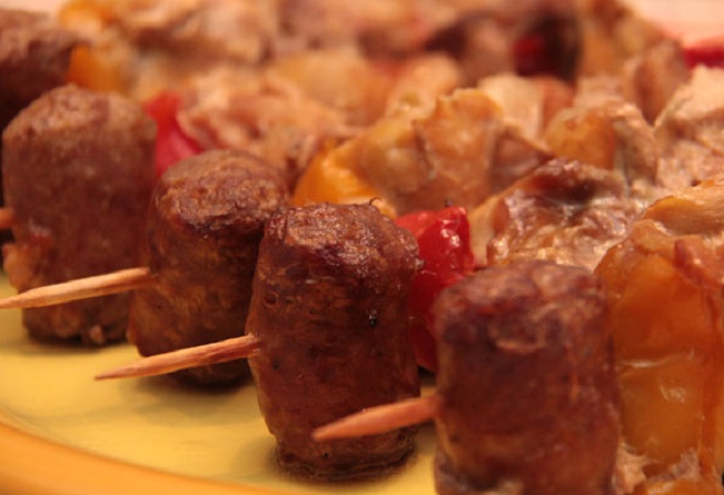Prendere degli stecchini lunghi fare dei dadini alternati di mortadella, emmenthal, lombo di maiale precedentemente