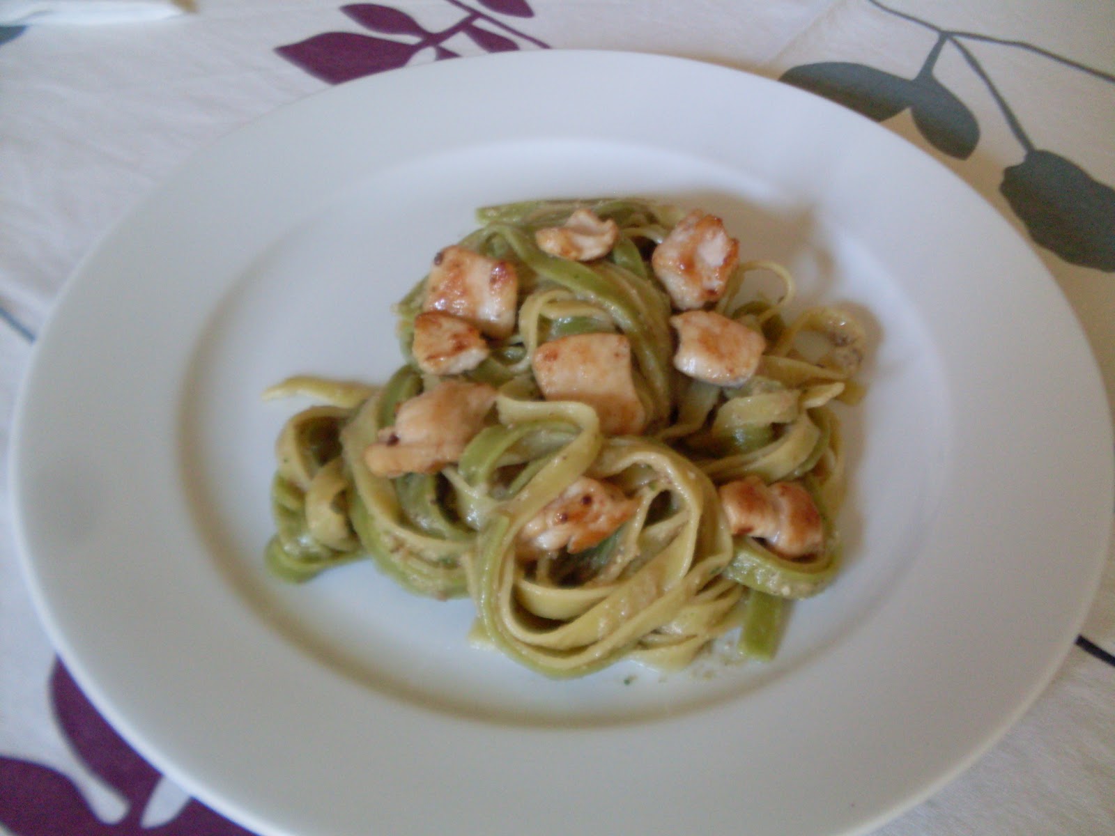 Linguine paglia e fieno con cubetti di pollo e pesto di melanzane