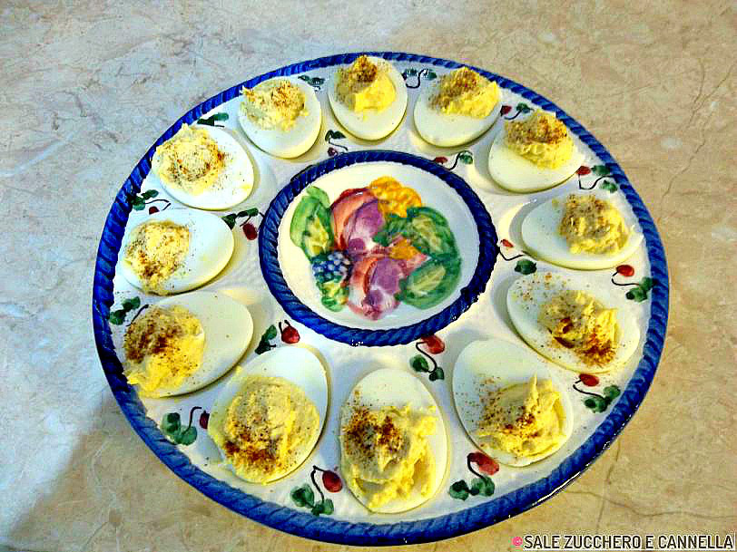 Lessate le uova per 8 minuti, a partire dal bollore, sgusciatele, dividetele a metà, nel senso della lunghezza e r...